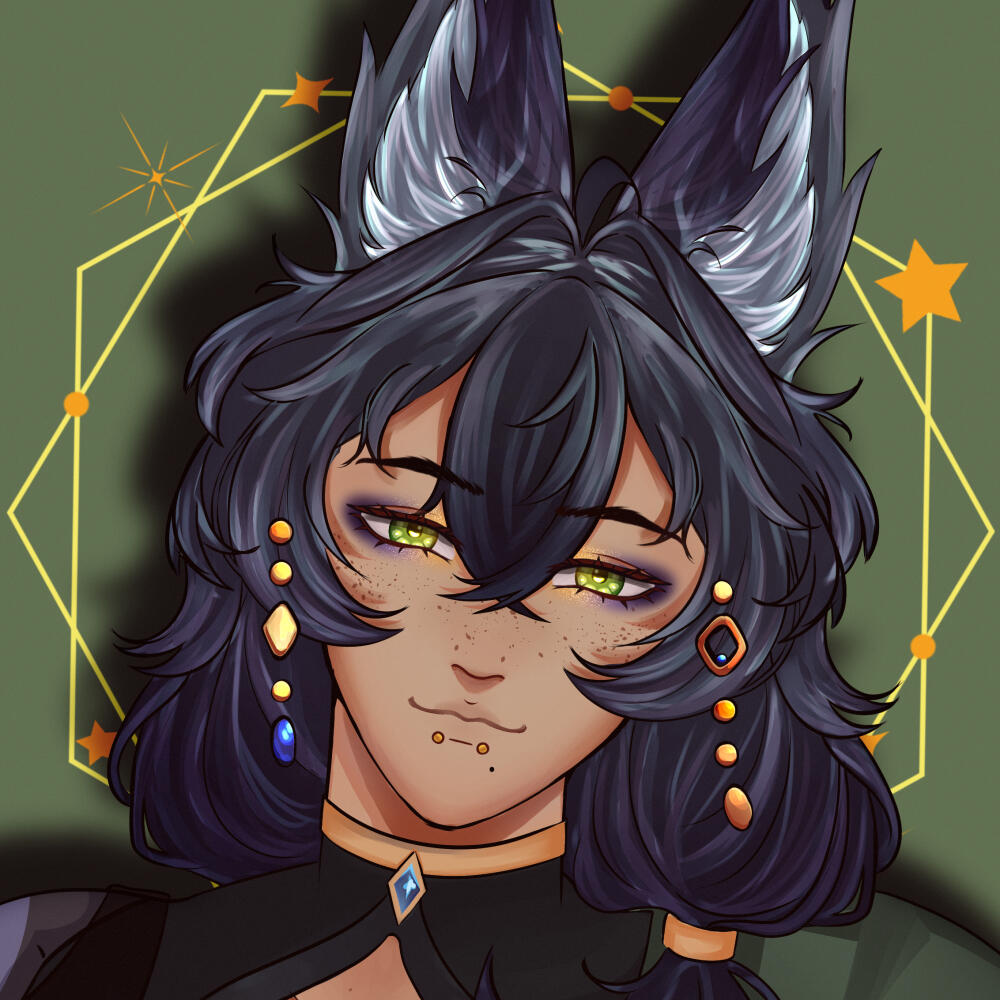 I use He/It pronouns, and celebrate my 'birth' on January 29th.The gem in my chest is a fragment of my heart, the sun, and houses what remains of my power. The rest was stolen away, used to give light to your world.You may find a little black cat roaming our temple, leave him be. He was once a comfort of mine, a plush now given life.