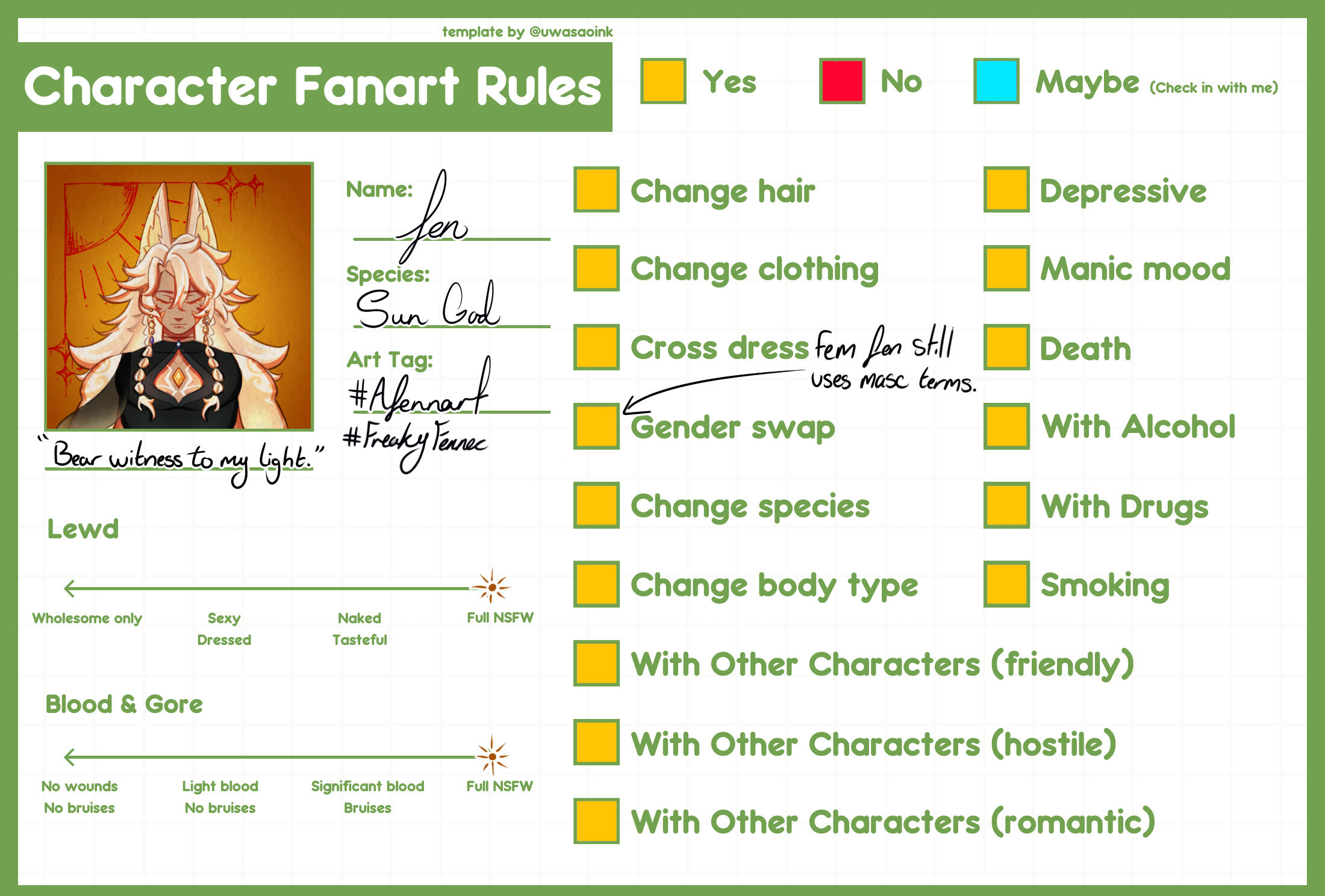 Here you can find references of Fen, and all of his alternative designs. This will be updated periodically.